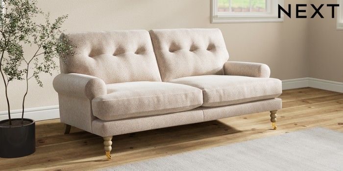 7.2.10 Erin Buttoned Back Deep Relaxed Sit 3 Seater Small Sofa Cotswold Chenille Light Natural High Classic Turned Brass Castor - Light | Made Click here to use our website with more accessibility support, for example screen readers