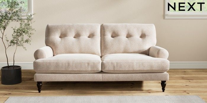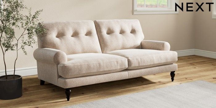 7.2.10 Erin Buttoned Back Deep Relaxed Sit 3 Seater Small Sofa Cotswold Chenille Light Natural High Classic Turned - Dark | Made Click here to use our website with more accessibility support, for example screen readers