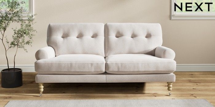 7.2.10 Erin Buttoned Back Deep Relaxed Sit 3 Seater Small Sofa Cotswold Chenille Oyster High Classic Turned Chrome Castor - Light | Made Click here to use our website with more accessibility support, for example screen readers