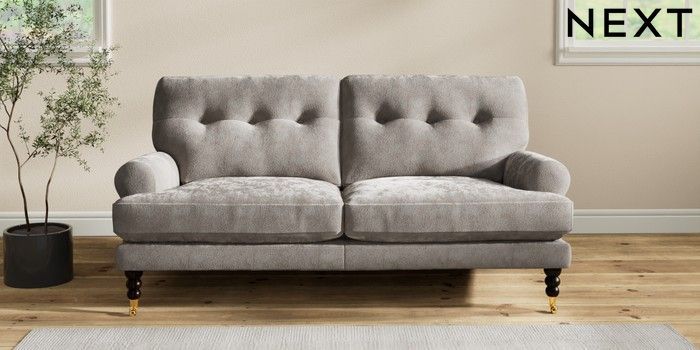 7.2.10 Erin Buttoned Back Deep Relaxed Sit 3 Seater Small Sofa Distressed Velour French Grey High Classic Turned Brass Castor - Dark | Made Click here to use our website with more accessibility support, for example screen readers
