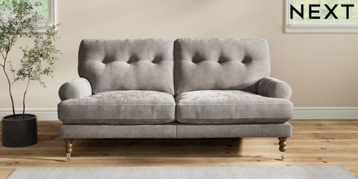 7.2.10 Erin Buttoned Back Deep Relaxed Sit 3 Seater Small Sofa Distressed Velour French Grey High Classic Turned Chrome Castor - Mid | Made Click here to use our website with more accessibility support, for example screen readers
