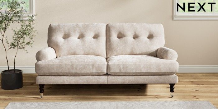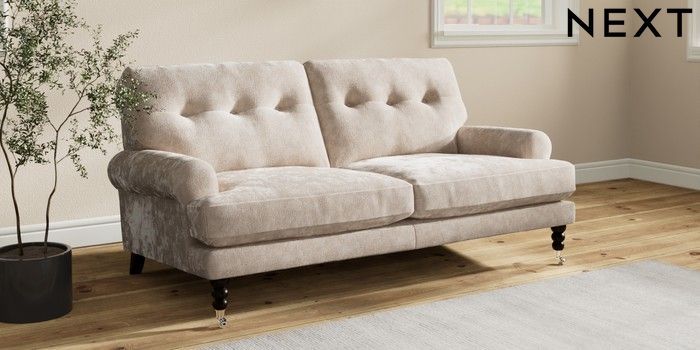 7.2.10 Erin Buttoned Back Deep Relaxed Sit 3 Seater Small Sofa Distressed Velour Mid Natural High Classic Turned Chrome Castor - Dark | Made Click here to use our website with more accessibility support, for example screen readers