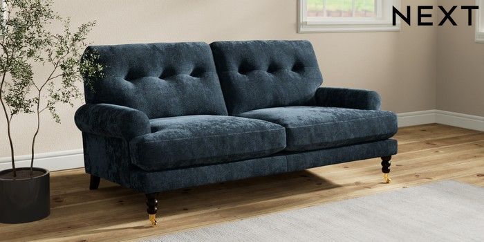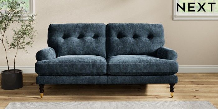 7.2.10 Erin Buttoned Back Deep Relaxed Sit 3 Seater Small Sofa Distressed Velour Midnight Blue High Classic Turned Brass Castor - Dark | Made Click here to use our website with more accessibility support, for example screen readers
