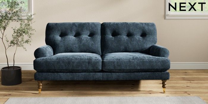 7.2.10 Erin Buttoned Back Deep Relaxed Sit 3 Seater Small Sofa Distressed Velour Midnight Blue High Classic Turned Brass Castor - Mid | Made Click here to use our website with more accessibility support, for example screen readers