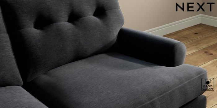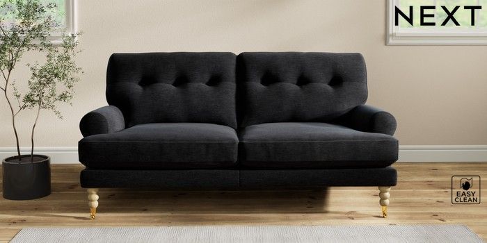 7.2.10 Erin Buttoned Back Deep Relaxed Sit 3 Seater Small Sofa Fine Chenille Easy Clean Black High Classic Turned Brass Castor - Light | Made Click here to use our website with more accessibility support, for example screen readers