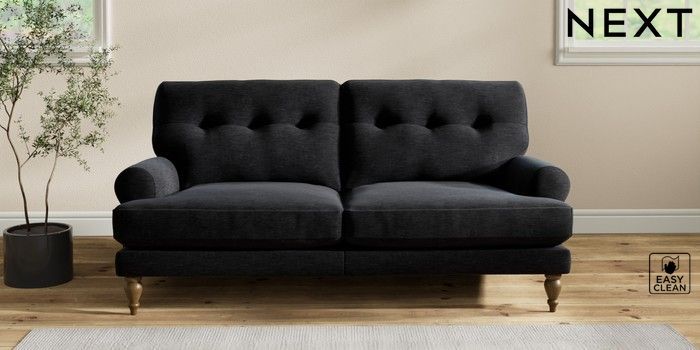 7.2.10 Erin Buttoned Back Deep Relaxed Sit 3 Seater Small Sofa Fine Chenille Easy Clean Black High Classic Turned - Mid | Made Click here to use our website with more accessibility support, for example screen readers