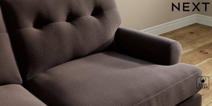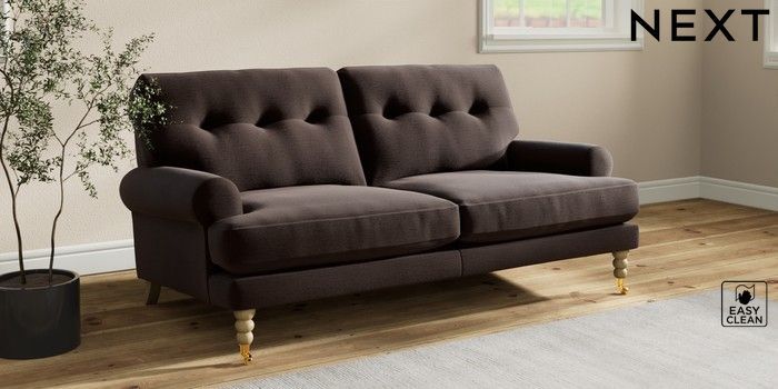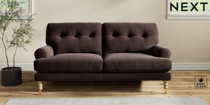 7.2.10 Erin Buttoned Back Deep Relaxed Sit 3 Seater Small Sofa Fine Chenille Easy Clean Chocolate Brown High Classic Turned Brass Castor - Light | Made Click here to use our website with more accessibility support, for example screen readers