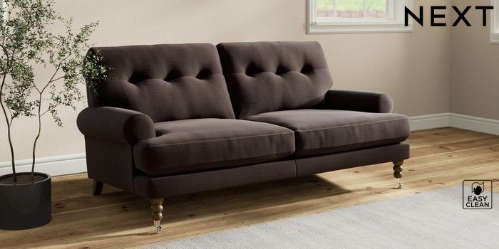 7.2.10 Erin Buttoned Back Deep Relaxed Sit 3 Seater Small Sofa Fine Chenille Easy Clean Chocolate Brown High Classic Turned Chrome Castor - Mid | Made Click here to use our website with more accessibility support, for example screen readers