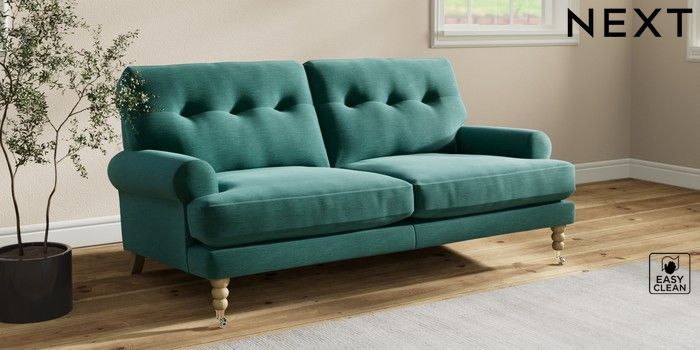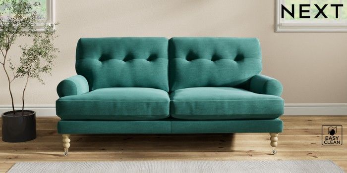 7.2.10 Erin Buttoned Back Deep Relaxed Sit 3 Seater Small Sofa Fine Chenille Easy Clean Dark Juniper Green High Classic Turned Chrome Castor - Light | Made Click here to use our website with more accessibility support, for example screen readers