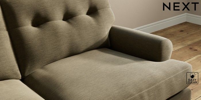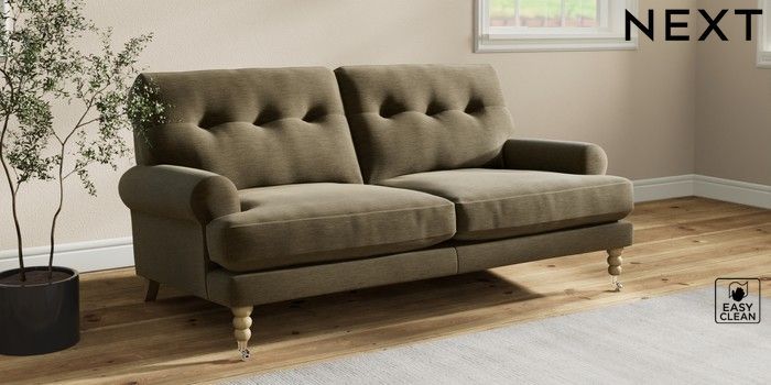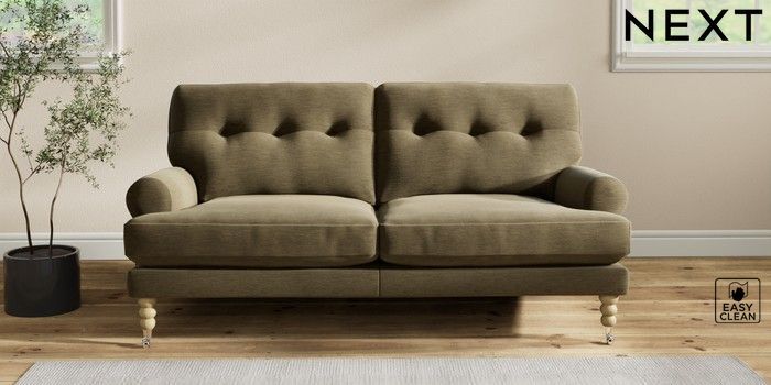 7.2.10 Erin Buttoned Back Deep Relaxed Sit 3 Seater Small Sofa Fine Chenille Easy Clean Dark Moss Green High Classic Turned Chrome Castor - Light | Made Click here to use our website with more accessibility support, for example screen readers