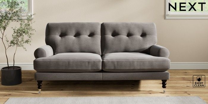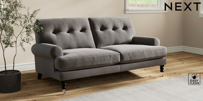 7.2.10 Erin Buttoned Back Deep Relaxed Sit 3 Seater Small Sofa Fine Chenille Easy Clean Dark Smoke Grey High Classic Turned Chrome Castor - Dark | Made Click here to use our website with more accessibility support, for example screen readers