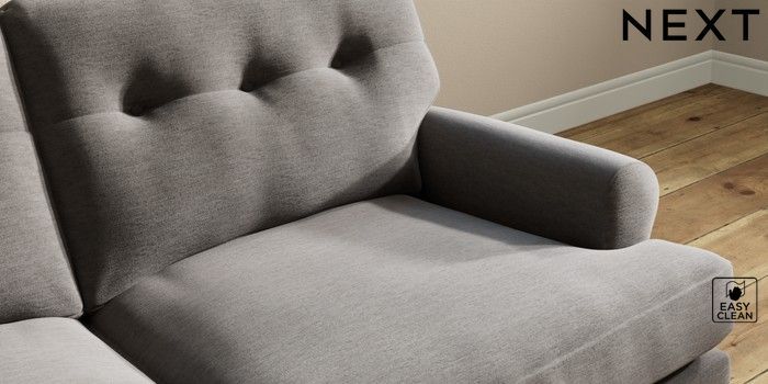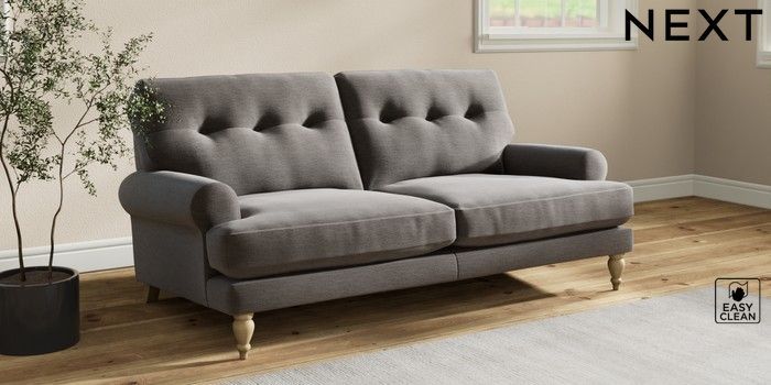 7.2.10 Erin Buttoned Back Deep Relaxed Sit 3 Seater Small Sofa Fine Chenille Easy Clean Dark Smoke Grey High Classic Turned - Light | Made Click here to use our website with more accessibility support, for example screen readers