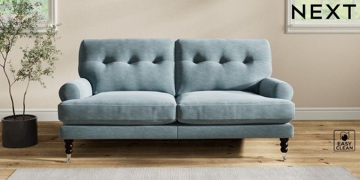 7.2.10 Erin Buttoned Back Deep Relaxed Sit 3 Seater Small Sofa Fine Chenille Easy Clean Mid Blue High Classic Turned Chrome Castor - Dark | Made Click here to use our website with more accessibility support, for example screen readers