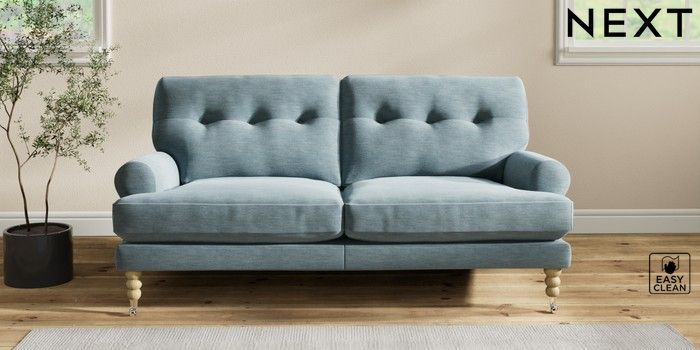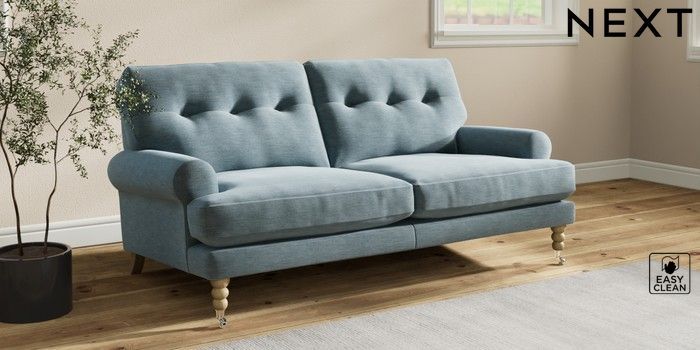 7.2.10 Erin Buttoned Back Deep Relaxed Sit 3 Seater Small Sofa Fine Chenille Easy Clean Mid Blue High Classic Turned Chrome Castor - Light | Made Click here to use our website with more accessibility support, for example screen readers