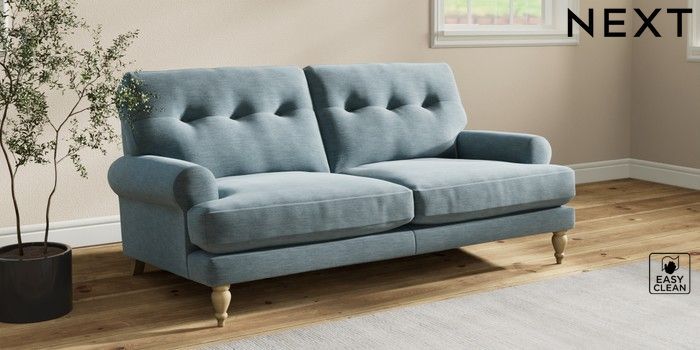 7.2.10 Erin Buttoned Back Deep Relaxed Sit 3 Seater Small Sofa Fine Chenille Easy Clean Mid Blue High Classic Turned - Light | Made Click here to use our website with more accessibility support, for example screen readers