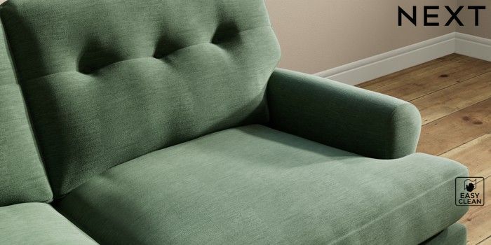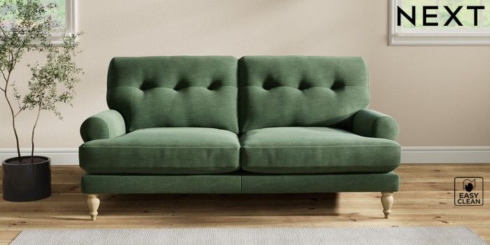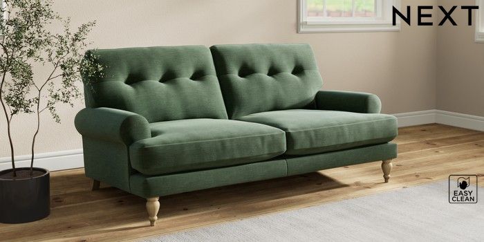 7.2.10 Erin Buttoned Back Deep Relaxed Sit 3 Seater Small Sofa Fine Chenille Easy Clean Mid Khaki Green High Classic Turned - Light | Made Click here to use our website with more accessibility support, for example screen readers