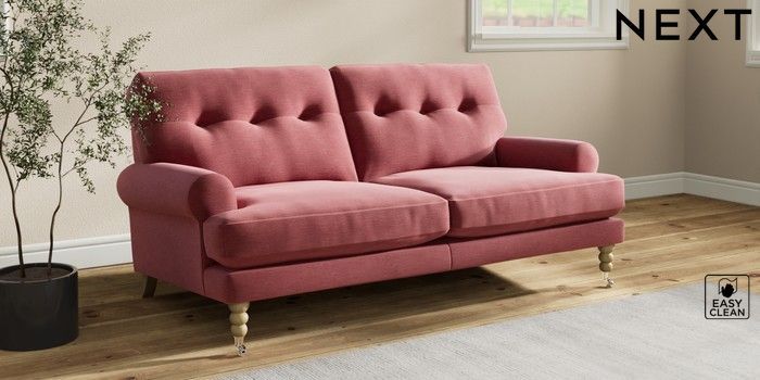 7.2.10 Erin Buttoned Back Deep Relaxed Sit 3 Seater Small Sofa Fine Chenille Easy Clean Mid Pink High Classic Turned Chrome Castor - Light | Made Click here to use our website with more accessibility support, for example screen readers