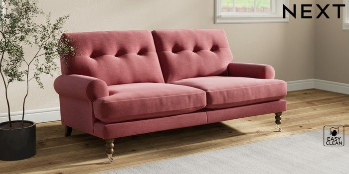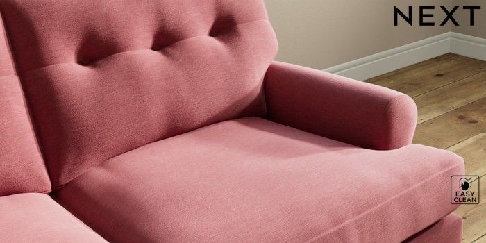 7.2.10 Erin Buttoned Back Deep Relaxed Sit 3 Seater Small Sofa Fine Chenille Easy Clean Mid Pink High Classic Turned Chrome Castor - Mid | Made Click here to use our website with more accessibility support, for example screen readers