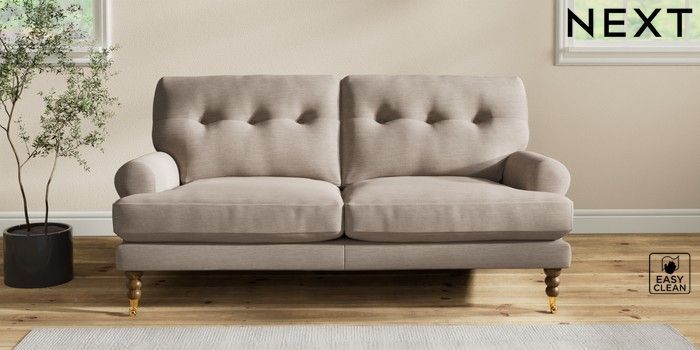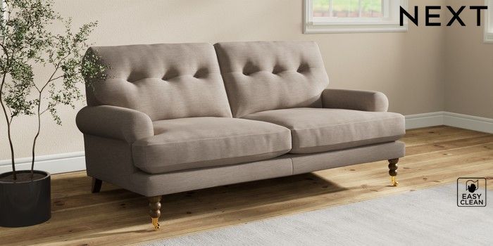 7.2.10 Erin Buttoned Back Deep Relaxed Sit 3 Seater Small Sofa Fine Chenille Easy Clean Mid Taupe Brown High Classic Turned Brass Castor - Mid | Made Click here to use our website with more accessibility support, for example screen readers