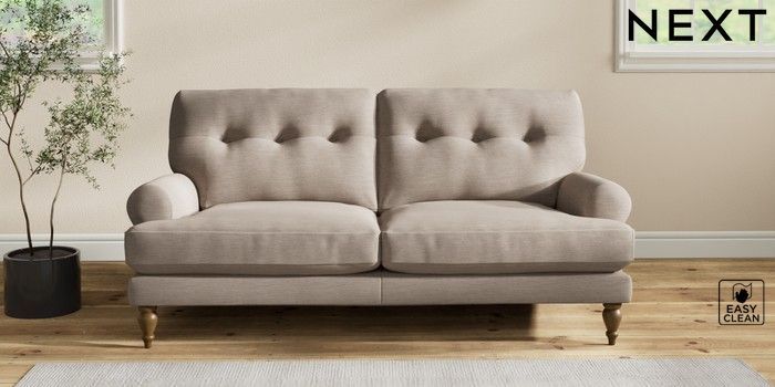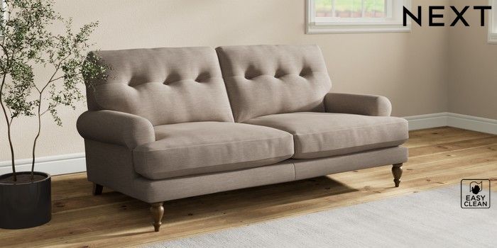 7.2.10 Erin Buttoned Back Deep Relaxed Sit 3 Seater Small Sofa Fine Chenille Easy Clean Mid Taupe Brown High Classic Turned - Mid | Made Click here to use our website with more accessibility support, for example screen readers