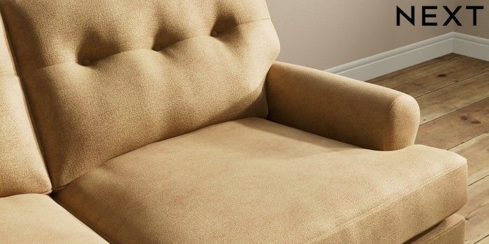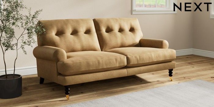 7.2.10 Erin Buttoned Back Deep Relaxed Sit 3 Seater Small Sofa Luxe Chenille Honey Yellow High Classic Turned Brass Castor - Dark | Made Click here to use our website with more accessibility support, for example screen readers