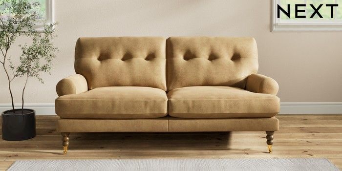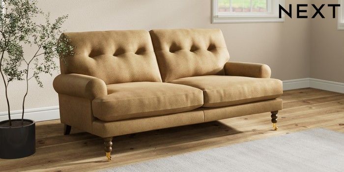 7.2.10 Erin Buttoned Back Deep Relaxed Sit 3 Seater Small Sofa Luxe Chenille Honey Yellow High Classic Turned Brass Castor - Mid | Made Click here to use our website with more accessibility support, for example screen readers
