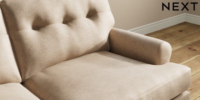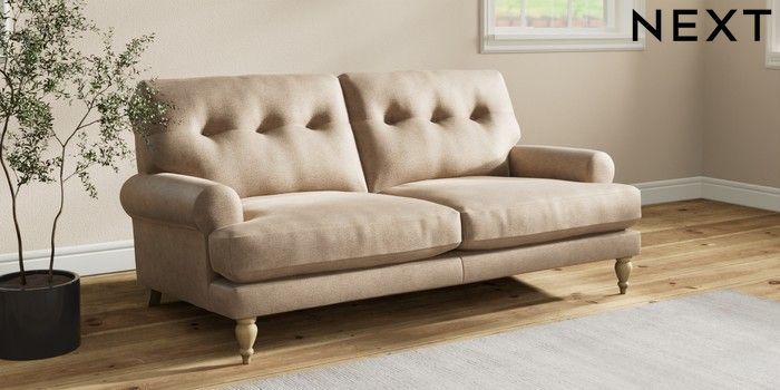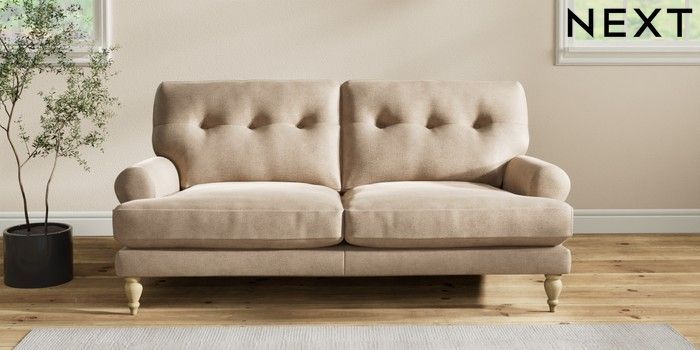 7.2.10 Erin Buttoned Back Deep Relaxed Sit 3 Seater Small Sofa Luxe Chenille Mid Camel Beige High Classic Turned - Light | Made Click here to use our website with more accessibility support, for example screen readers