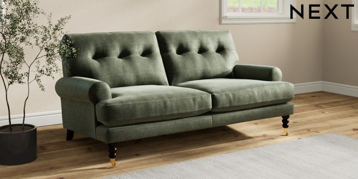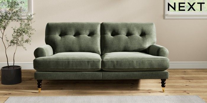 7.2.10 Erin Buttoned Back Deep Relaxed Sit 3 Seater Small Sofa Luxe Chenille Mid Green High Classic Turned Brass Castor - Dark | Made Click here to use our website with more accessibility support, for example screen readers