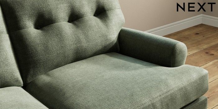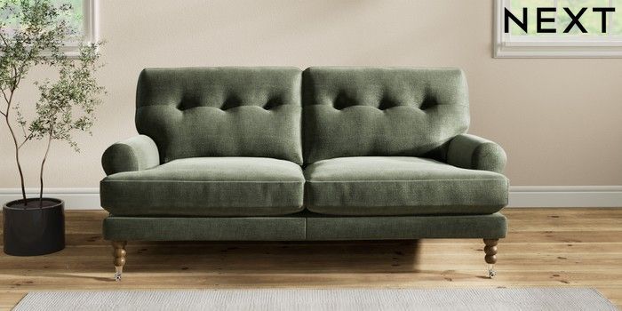 7.2.10 Erin Buttoned Back Deep Relaxed Sit 3 Seater Small Sofa Luxe Chenille Mid Green High Classic Turned Chrome Castor - Mid | Made Click here to use our website with more accessibility support, for example screen readers