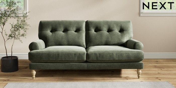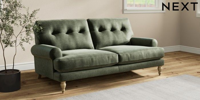 7.2.10 Erin Buttoned Back Deep Relaxed Sit 3 Seater Small Sofa Luxe Chenille Mid Green High Classic Turned - Light | Made Click here to use our website with more accessibility support, for example screen readers