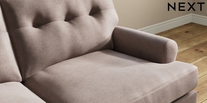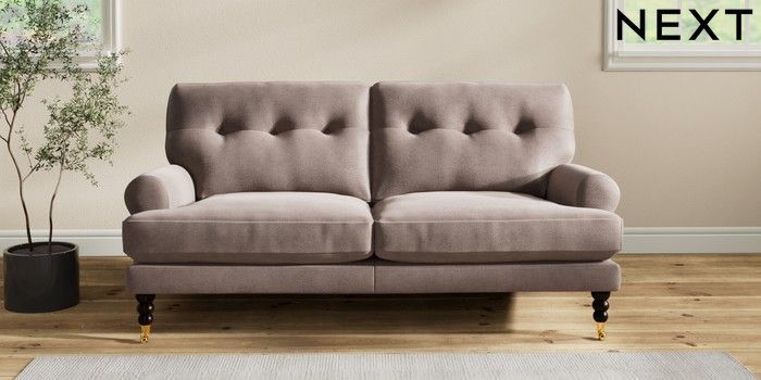 7.2.10 Erin Buttoned Back Deep Relaxed Sit 3 Seater Small Sofa Luxe Chenille Mink Brown High Classic Turned Brass Castor - Dark | Made Click here to use our website with more accessibility support, for example screen readers