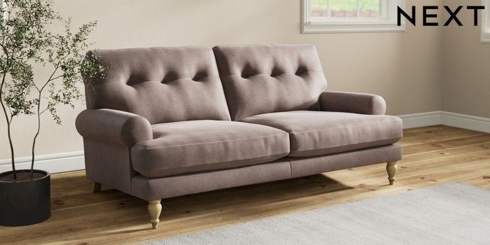 7.2.10 Erin Buttoned Back Deep Relaxed Sit 3 Seater Small Sofa Luxe Chenille Mink Brown High Classic Turned - Light | Made Click here to use our website with more accessibility support, for example screen readers