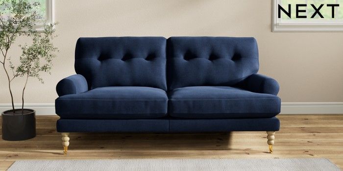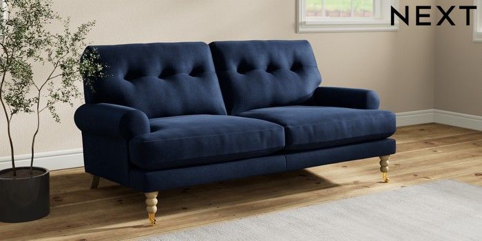7.2.10 Erin Buttoned Back Deep Relaxed Sit 3 Seater Small Sofa Luxe Chenille Navy Blue High Classic Turned Brass Castor - Light | Made Click here to use our website with more accessibility support, for example screen readers