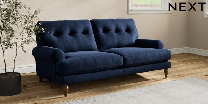 7.2.10 Erin Buttoned Back Deep Relaxed Sit 3 Seater Small Sofa Luxe Chenille Navy Blue High Classic Turned - Mid | Made Click here to use our website with more accessibility support, for example screen readers