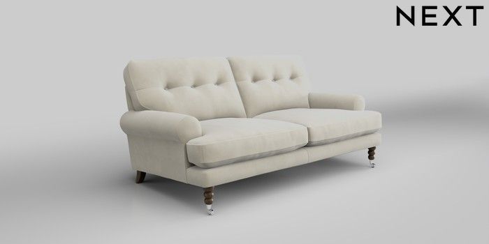 7.2.10 Erin Buttoned Back Deep Relaxed Sit 3 Seater Small Sofa Luxe Chenille Oyster High Classic Turned Chrome Castor - Mid | Made Click here to use our website with more accessibility support, for example screen readers