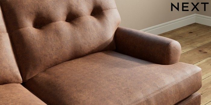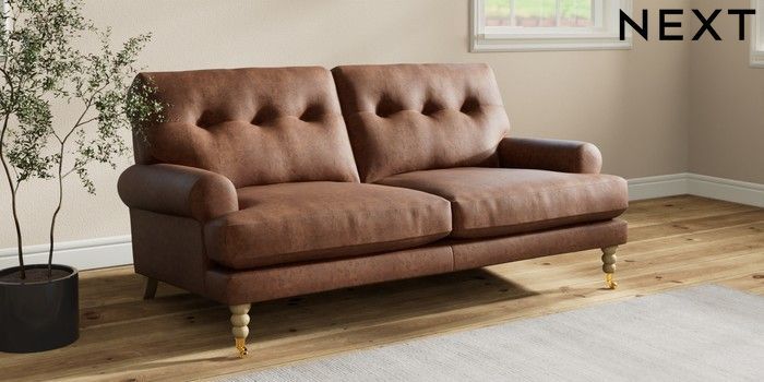7.2.10 Erin Buttoned Back Deep Relaxed Sit 3 Seater Small Sofa Monza Faux Leather Easy Clean Chestnut Brown High Classic Turned Brass Castor - Light | Made Click here to use our website with more accessibility support, for example screen readers