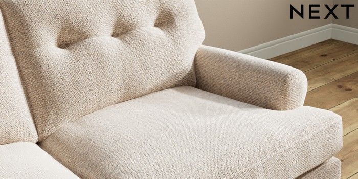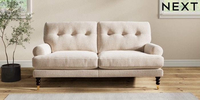 7.2.10 Erin Buttoned Back Deep Relaxed Sit 3 Seater Small Sofa Multi Weave Mid Natural High Classic Turned Brass Castor - Dark | Made Click here to use our website with more accessibility support, for example screen readers