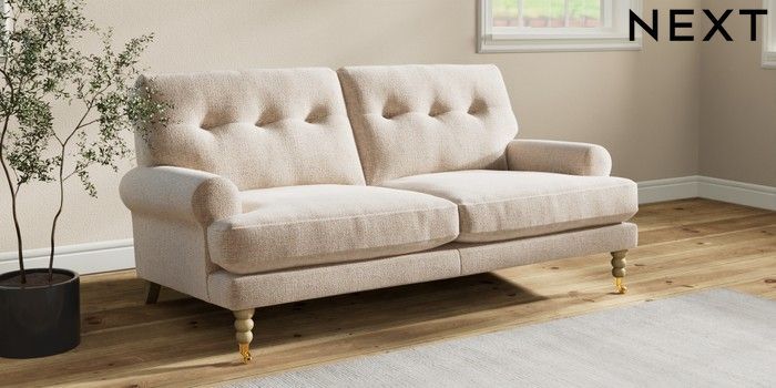 7.2.10 Erin Buttoned Back Deep Relaxed Sit 3 Seater Small Sofa Multi Weave Mid Natural High Classic Turned Brass Castor - Light | Made Click here to use our website with more accessibility support, for example screen readers