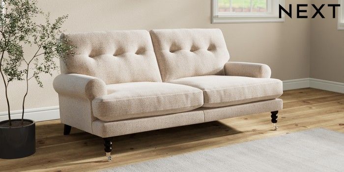 7.2.10 Erin Buttoned Back Deep Relaxed Sit 3 Seater Small Sofa Multi Weave Mid Natural High Classic Turned Chrome Castor - Dark | Made Click here to use our website with more accessibility support, for example screen readers