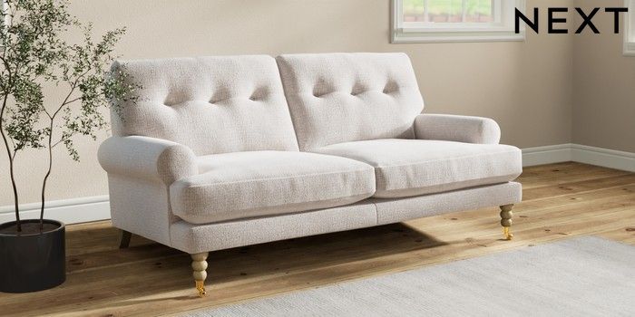 7.2.10 Erin Buttoned Back Deep Relaxed Sit 3 Seater Small Sofa Multi Weave Oyster High Classic Turned Brass Castor - Light | Made Click here to use our website with more accessibility support, for example screen readers