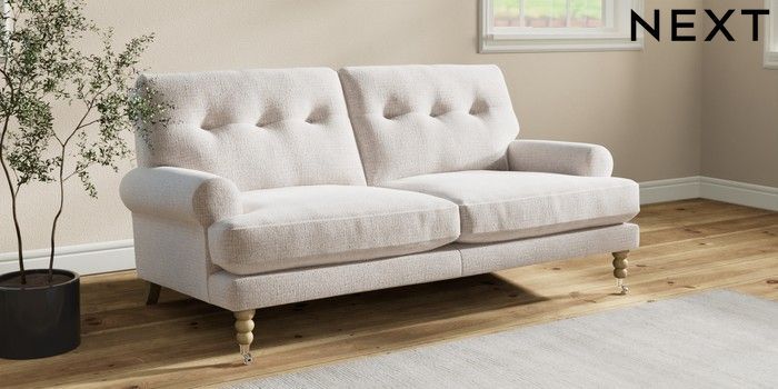 7.2.10 Erin Buttoned Back Deep Relaxed Sit 3 Seater Small Sofa Multi Weave Oyster High Classic Turned Chrome Castor - Light | Made Click here to use our website with more accessibility support, for example screen readers