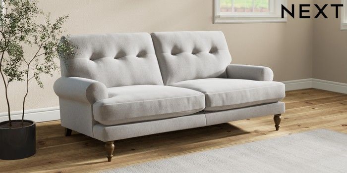 7.2.10 Erin Buttoned Back Deep Relaxed Sit 3 Seater Small Sofa Natural Mix Light Grey High Classic Turned - Mid | Made Click here to use our website with more accessibility support, for example screen readers
