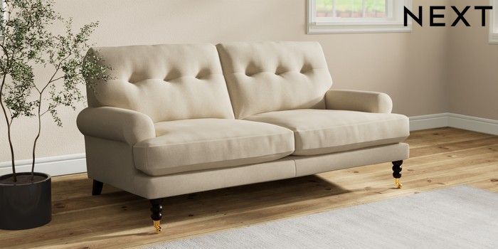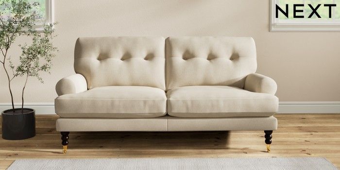 7.2.10 Erin Buttoned Back Deep Relaxed Sit 3 Seater Small Sofa Natural Mix Light Natural High Classic Turned Brass Castor - Dark | Made Click here to use our website with more accessibility support, for example screen readers