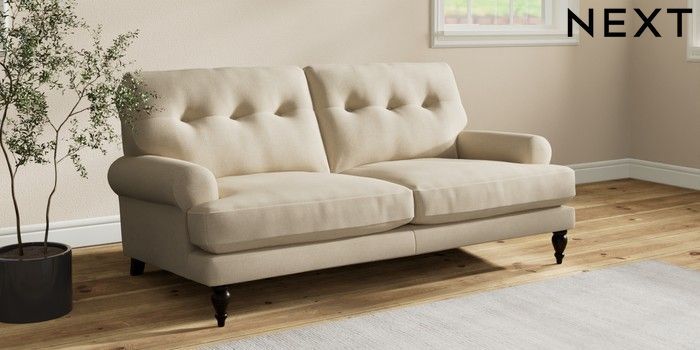 7.2.10 Erin Buttoned Back Deep Relaxed Sit 3 Seater Small Sofa Natural Mix Light Natural High Classic Turned - Dark | Made Click here to use our website with more accessibility support, for example screen readers