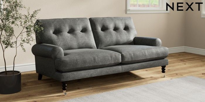 7.2.10 Erin Buttoned Back Deep Relaxed Sit 3 Seater Small Sofa Plush Chenille Dark Grey High Classic Turned Chrome Castor - Dark | Made Click here to use our website with more accessibility support, for example screen readers