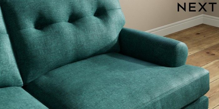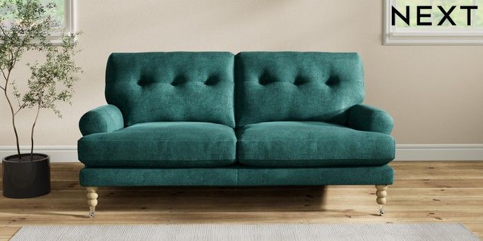 7.2.10 Erin Buttoned Back Deep Relaxed Sit 3 Seater Small Sofa Plush Chenille Dark Teal Green High Classic Turned Chrome Castor - Light | Made Click here to use our website with more accessibility support, for example screen readers