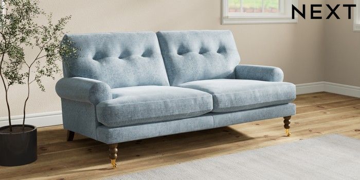 7.2.10 Erin Buttoned Back Deep Relaxed Sit 3 Seater Small Sofa Plush Chenille Light Blue High Classic Turned Brass Castor - Mid | Made Click here to use our website with more accessibility support, for example screen readers