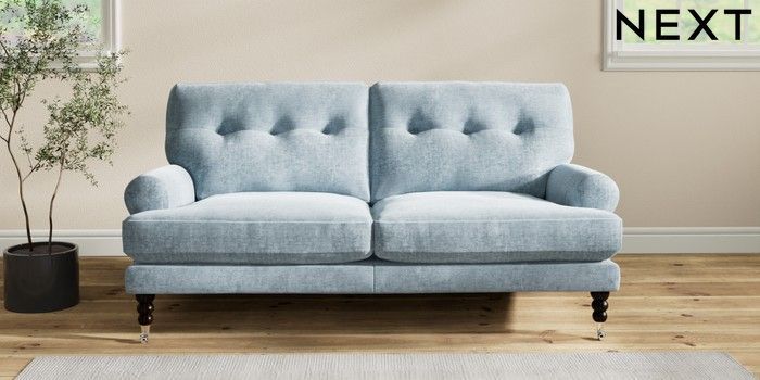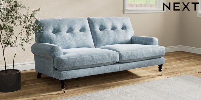 7.2.10 Erin Buttoned Back Deep Relaxed Sit 3 Seater Small Sofa Plush Chenille Light Blue High Classic Turned Chrome Castor - Dark | Made Click here to use our website with more accessibility support, for example screen readers