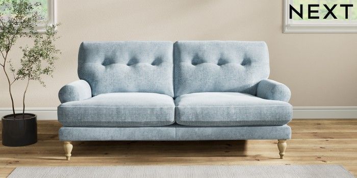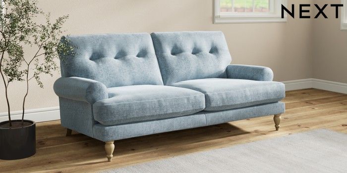 7.2.10 Erin Buttoned Back Deep Relaxed Sit 3 Seater Small Sofa Plush Chenille Light Blue High Classic Turned - Light | Made Click here to use our website with more accessibility support, for example screen readers