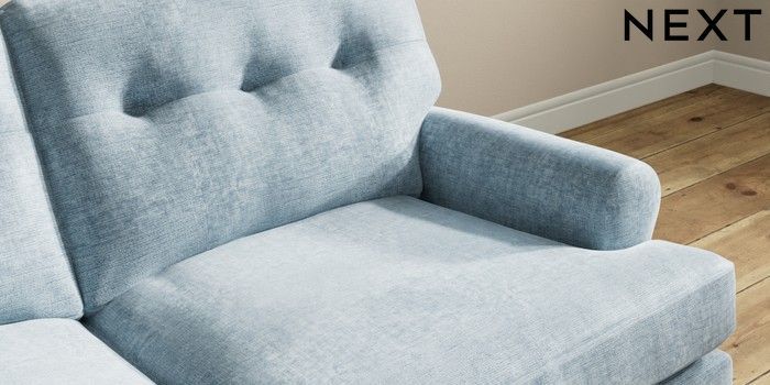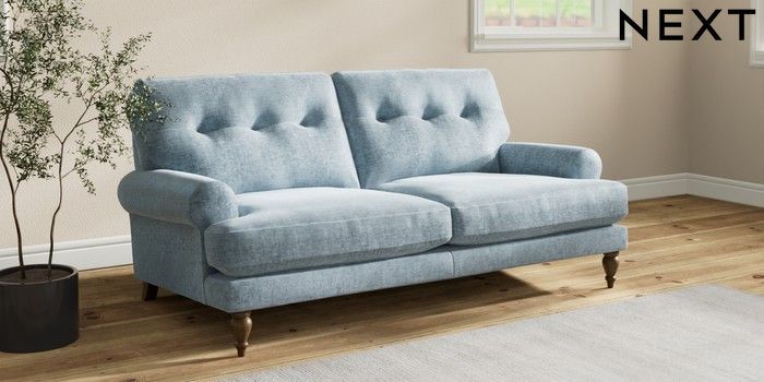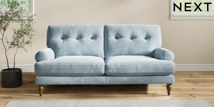 7.2.10 Erin Buttoned Back Deep Relaxed Sit 3 Seater Small Sofa Plush Chenille Light Blue High Classic Turned - Mid | Made Click here to use our website with more accessibility support, for example screen readers